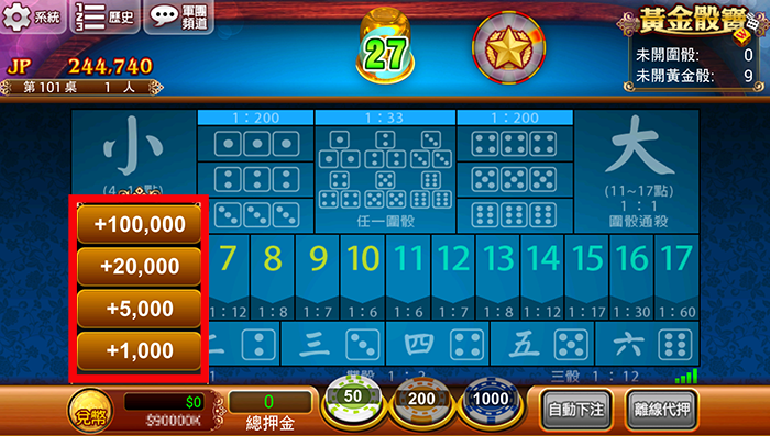 | 每一區有三個遊戲桌,並顯示目前各桌[人數]、[未開黃金骰次數]、[未開圍骰次數]、[累積JP獎金] 等資訊。 |