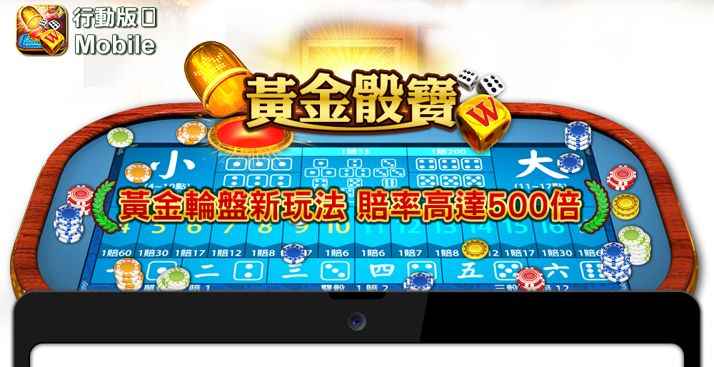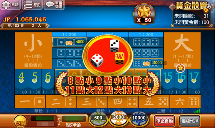 每局黃金輪會隨機亮燈在[點數總和]及[圍骰]上, 當骰盅開出的點數與亮燈相同時即可得獎。最高 可獲得500倍的的額外獎金唷!!