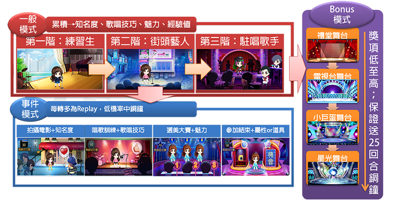 ※需完成三階段可進Bonus模式,可與其他偶像進行比賽獲得最終獎勵。