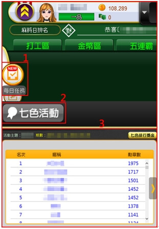 麻將/撲克牌友桌、各級賽事,每圈\每回合隨機贈送七色獎章(共七種),底台底注越高,可獲得的數量越多喔!
