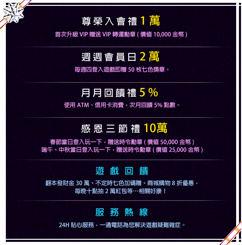 - 『會員日』是以當日進行中的七色活動之獎章作為發放禮,每枚價值為10金幣,整年度享有2萬獎勵。