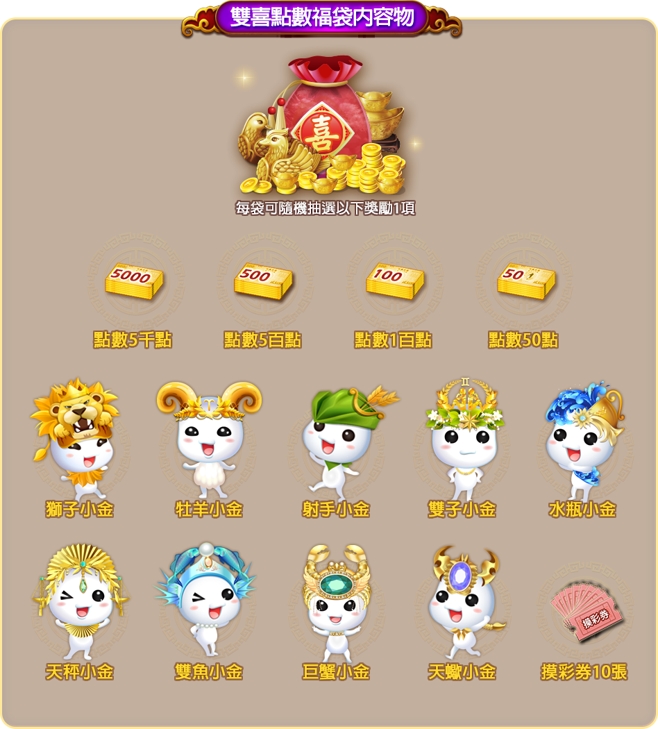 - 遊戲中所獲得雙喜點數福袋請於[商城]- [倉庫]開取獎勵。