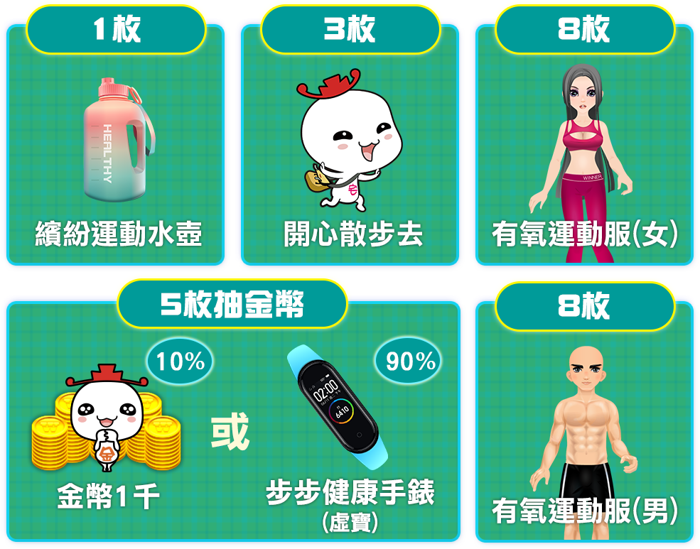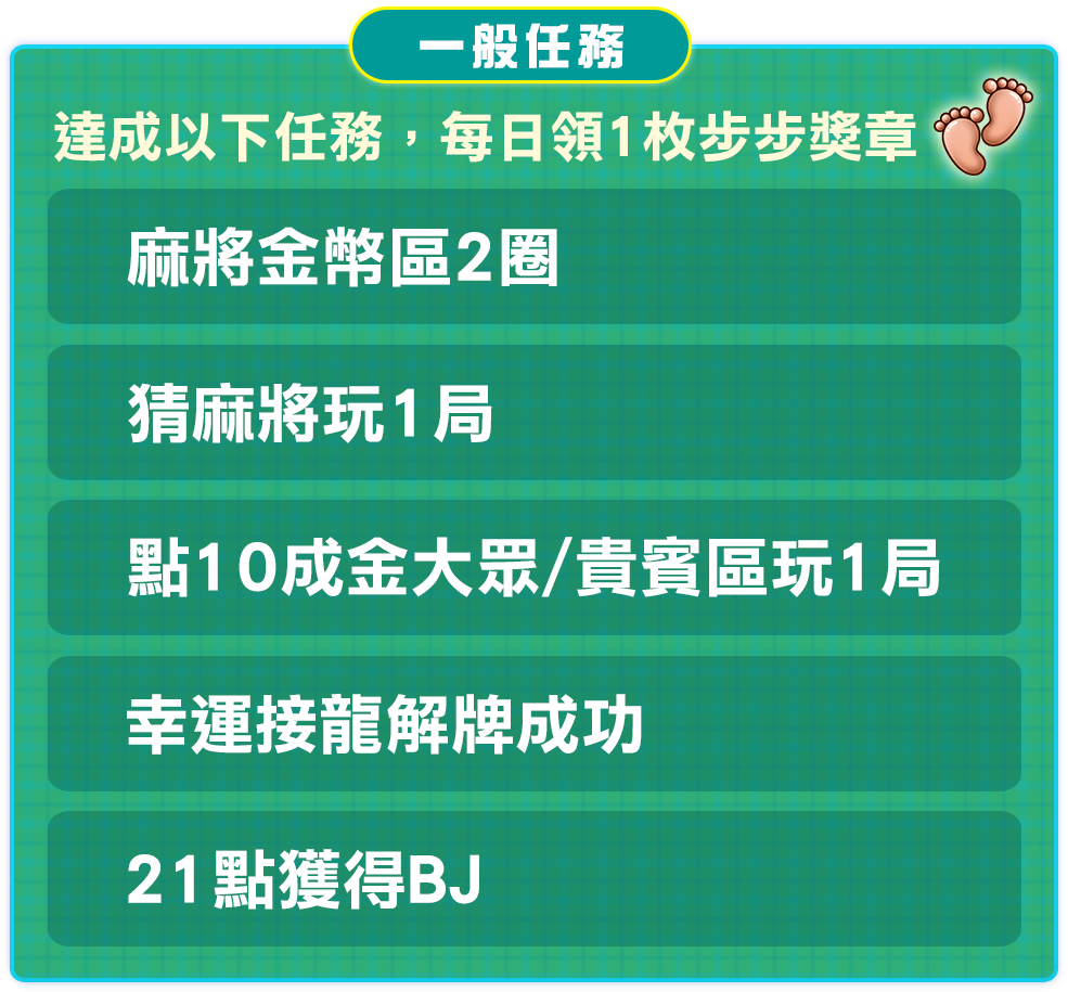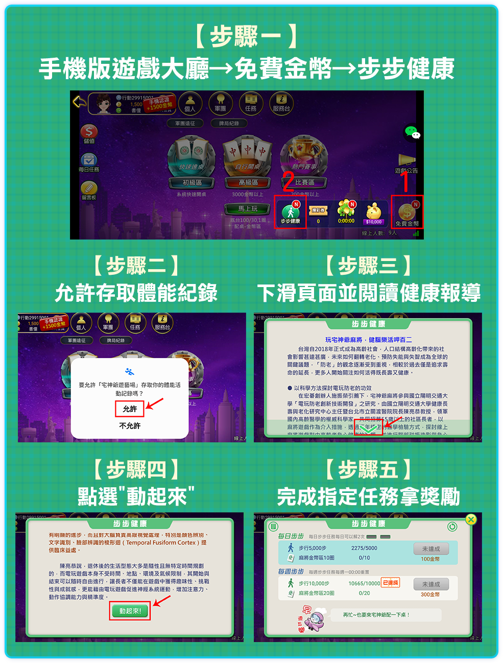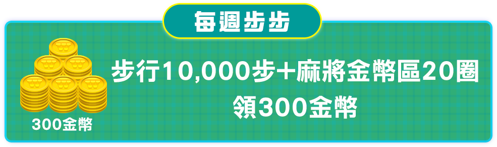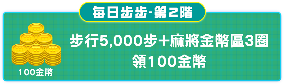 - 【每日步步】、【每週步步】獎勵請至手機版遊戲大廳【免費金幣】→【步步健康】內自行領獎,並請於當日23:59前領獎完畢。(逾時則無法領取。)