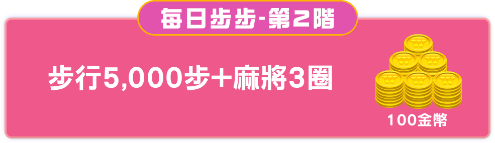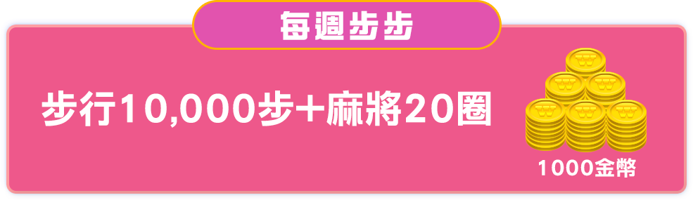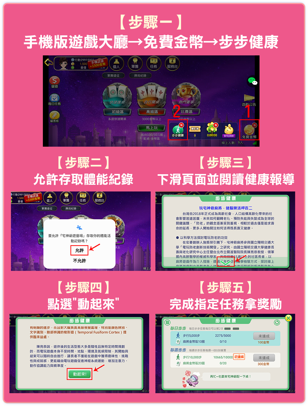 - 【步步健康】獎勵請至手機版遊戲大廳【免費金幣】→【步步健康】內自行領獎,並請於當日23:59前領獎完畢。(逾時則無法領取。)
