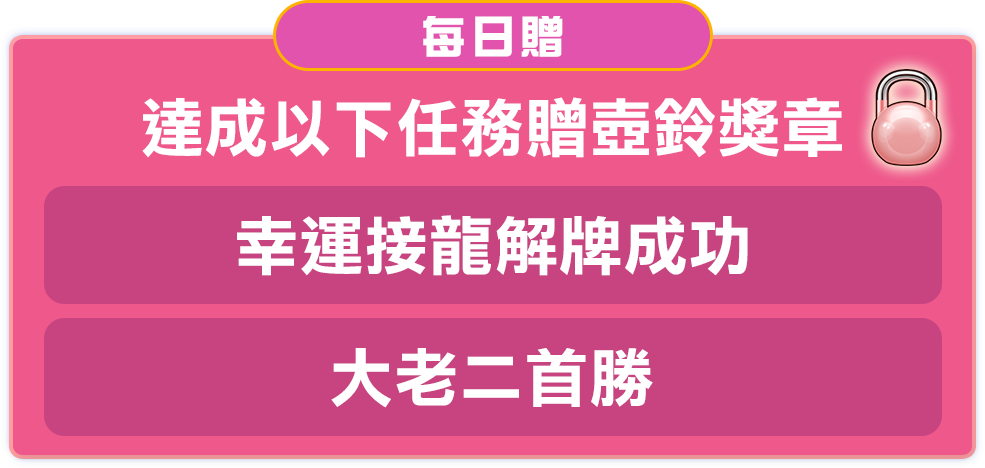 - 【每日贈】獎勵請至【一般任務】內自行領獎,並請於當日23:59前領獎完畢。(若隔日領取,則該日達成將無法再領相同獎勵。)