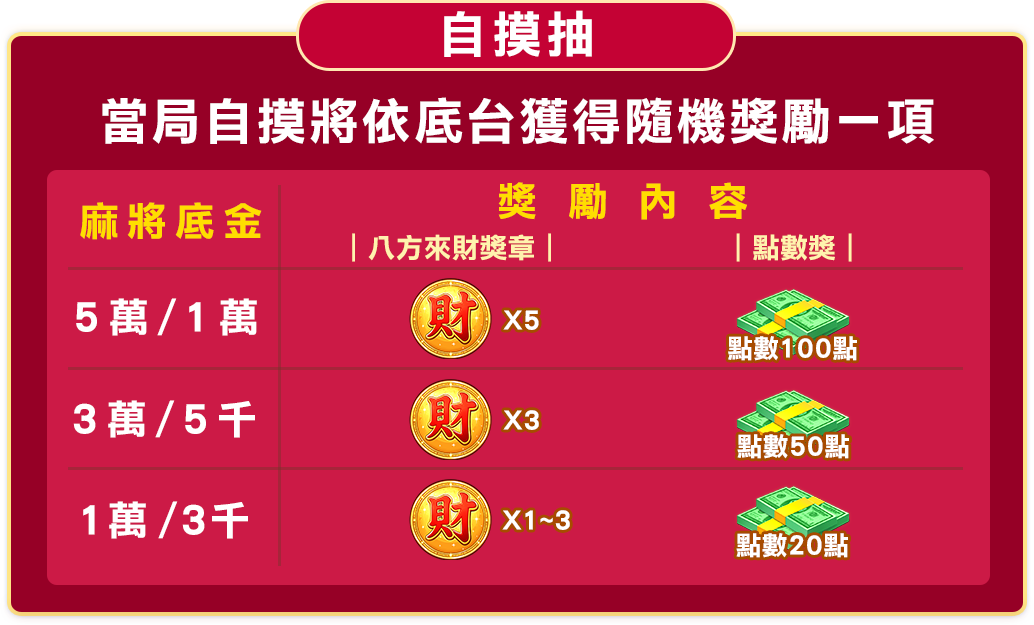 當局自摸隨機抽點數、八方來財獎章,