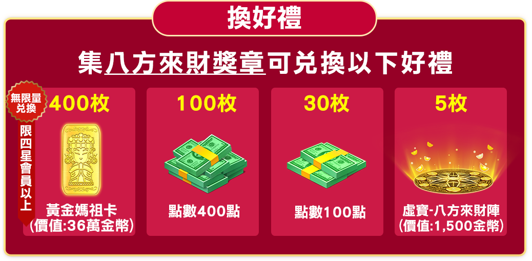 集八方來財獎章達指定數量可換黃金卡!
